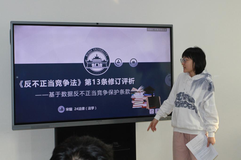 田沐禾老师结合数字经济快速发展,提到元宇宙、生成式人工智能等新业态涌现,进一步给竞争法带来了诸多新挑战,而同学们在汇报中对相关问题的关注与思考,正是面向未来法律思维的有效训练。她强调,作为未来的法律人,不仅要具备解读现有法律文本的能力,更需培养预见未来问题、参与规则建构的能力,应当学会理解技术逻辑、平衡多元利益、适应快速变化的法律环境。在此基础上,沐老师给出了三点研究建议:一是保持跨学科视野,数字经济领域的竞争法问题涉及经济学、社会学、计算机科学等多学科知识,理解技术逻辑是开展法律分析的重要前提;二是培养动态思考能力,法律修订并非终点而是新起点,需持续关注法律实施后市场主体的行为调整与监管机构的执法动态;三是树立全球比较视野,在全球化数字经济背景下,各国竞争法呈现相互借鉴又各具特色的发展趋势,通过比较研究既能更好地理解中国法律的特点,也能为未来法律完善提供有益参考。