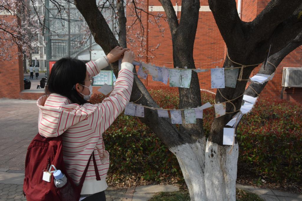 春意盎然,生机勃勃的校园为本次心理活动营造出清新自然的氛围。活动现场,同学们有序地自主领取创作物料,花朵便利贴抒发内心感受有的同学写下当下的心情感悟,有的描绘校园春日的美丽景致,还有的写下对自己的温暖寄语。同学们将内心的所思所感化作笔尖流淌的温情文字将这份独属于自己的“春日心情”夹在展示绳上。一张张缤纷的花朵便利贴相互串联,形成了一面温馨的“春日心情栏”。